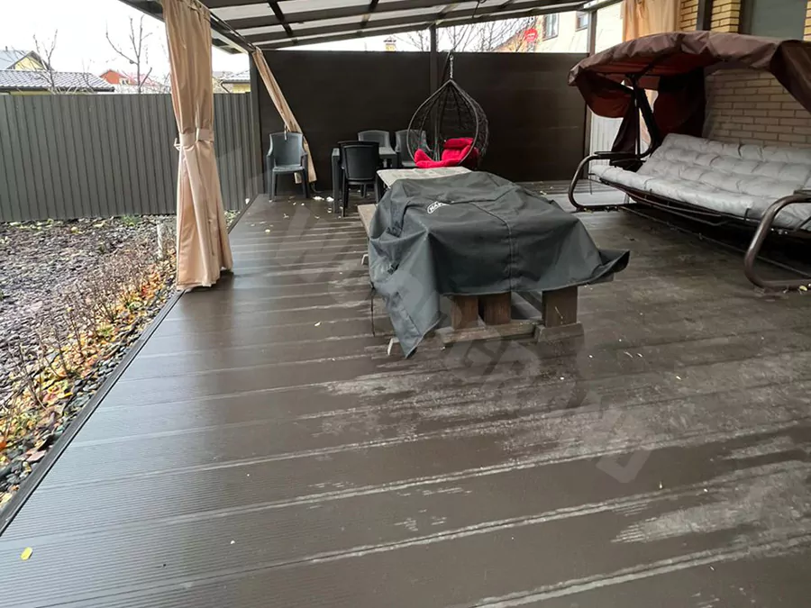Еще пару слов от Айрата, владельца веранды: "Еще одним немаловажным плюсом для меня стала легкость ухода за доской. Это действительно практичный и функциональный выбор, и я безусловно рекомендую продукцию WOODGRAND всем, кто ценит комфорт, стабильность и красивый внешний вид! Также замечу, что веранду думал делать: закрытой или открытой, с окнами или без. В итоге остановил свой выбор на открытой веранде к дому"